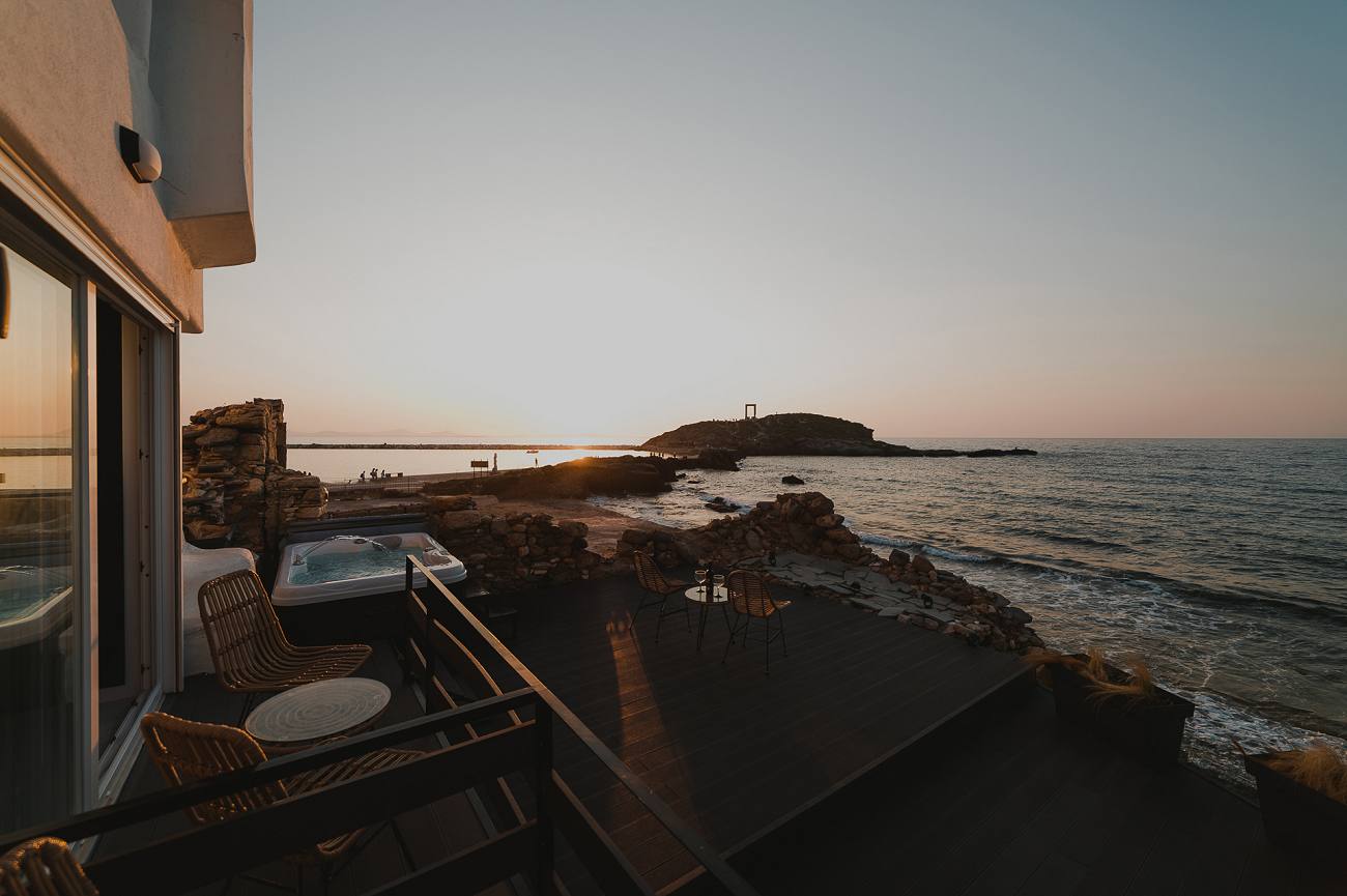 Located in front of the sea, the Portara Deluxe Suite is the perfect choice for those seeking a beach front spacious, cozy accommodation with unobstructed spectacular views.